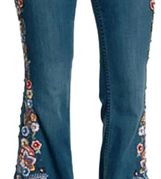 Women Embroidery Bell Bottom Jeans Slim Washed Floral Graphic Blue Jean Casual High Waist Pants