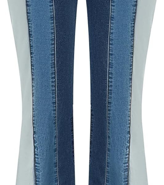 Women Patchwork Flare Jeans Stretch High Waisted Bell Bottom Raw Hem Denim Pants