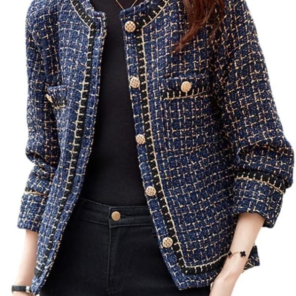 Women's Wool Cropped Tweed Jacket Blazer Button-up Slim Fit with Pockets