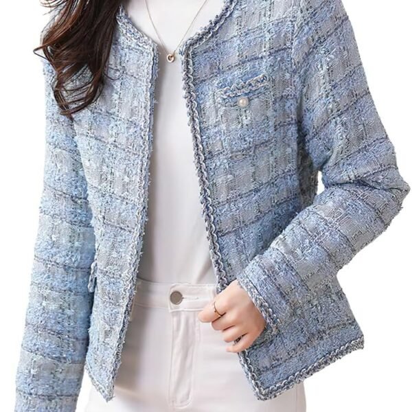 Women's Elegant Open Front Tweed Jacket Slim Collarless Bussiness Casual Blazer Jacket