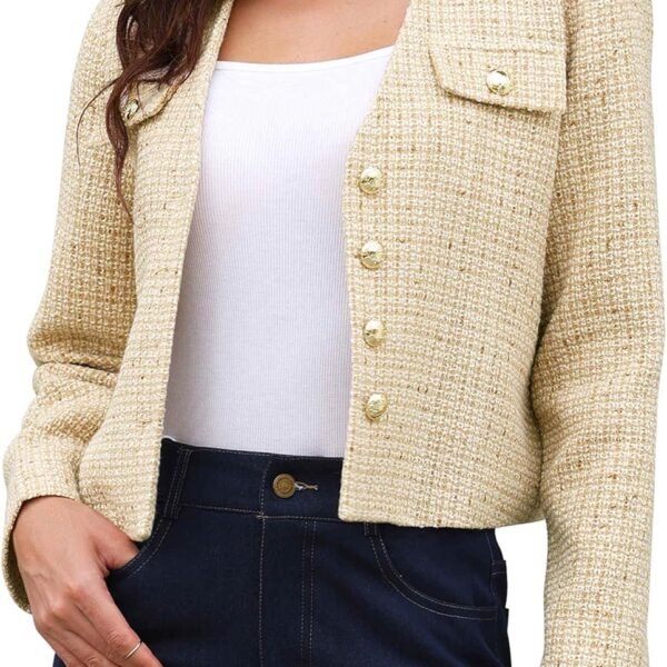 Women's Long Sleeve Cropped Tweed Jacket with Pocket Button Slim Fit Work Office Short Tweed Blazer