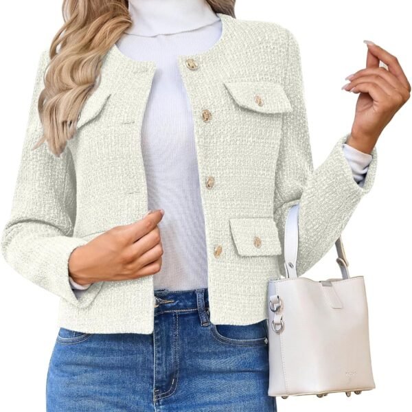 Womens Tweed Blazer Jacket, Cropped Long Sleeve Blazers with Pockets Crewneck Open Front Collarless