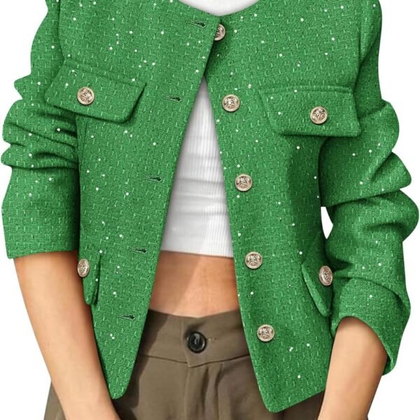 Women's Tweed Blazers Trendy Fall Casual Collarless Button Down Sequin Tops Cropped Jackets with Pockets