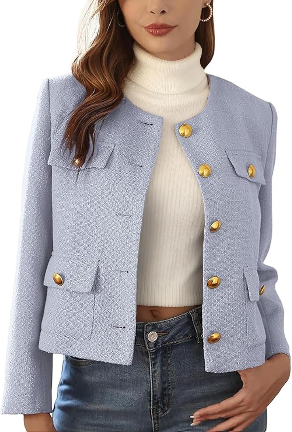 - Classic Chic: This long sleeve collarless casual tweed blazer is a classic piece and a wardrobe essential. Cropped design makes you look neater and crisper